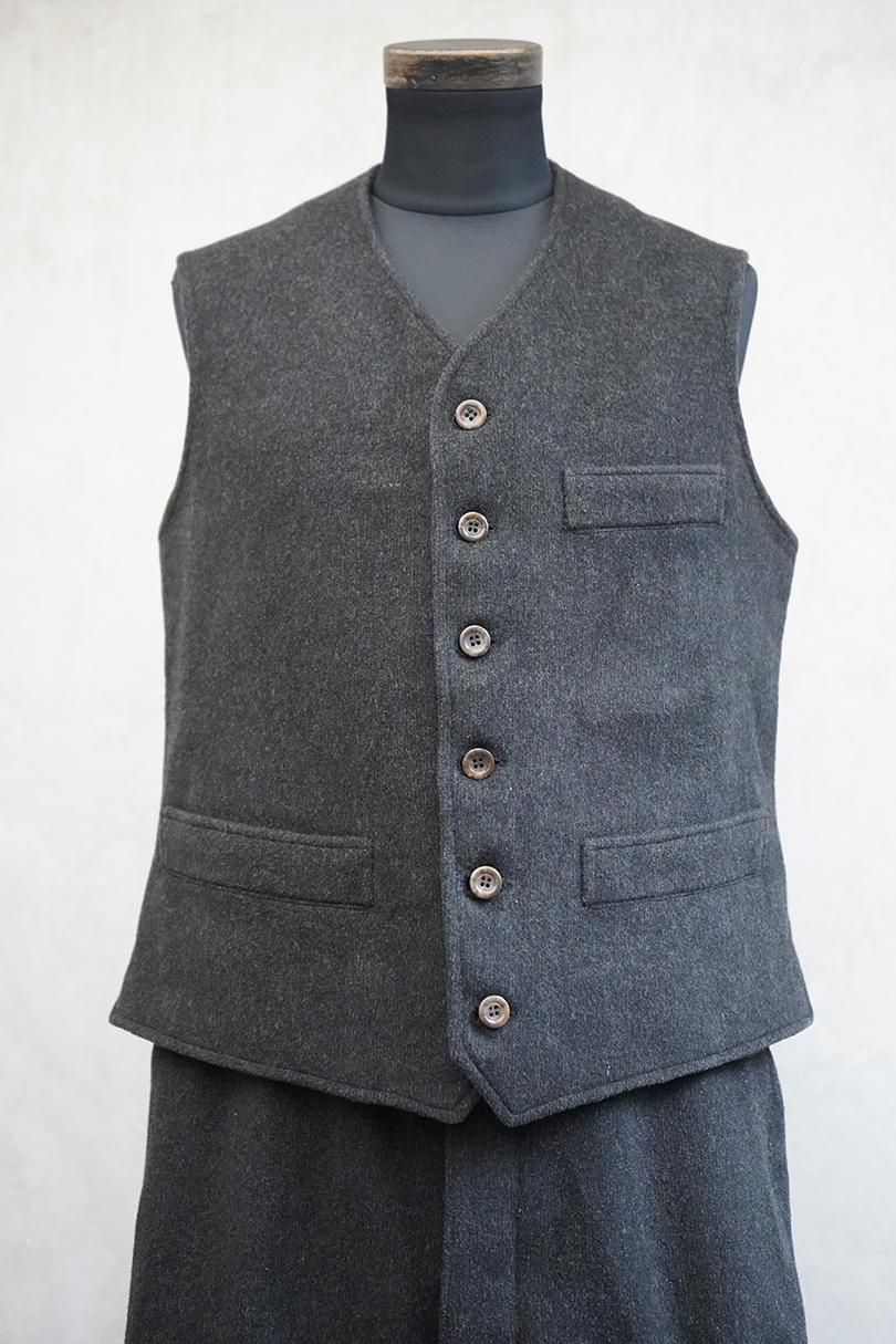1940年代頃までにつくられたジレとパンツのセット。厚手の良いウール素材です。フロントに3つのポケットのジレ。ボタンはコロゾナット。ストライプの裏地も良い風合いです。ボタン留めの内ポケット付き。裏地中央あたりにサビによるシミと穴があります。爆心地で身幅の調節ができます。パンツのポケットは左右のみ、ステッチ入りです。フロントはボタンフライ、 内側にストラップがついた良い仕様(パンチェリーナ)です。ウエストラインにサスペンダー用ボタン、バックシンチ。バック中央あたりに擦れた傷み、裏地にサビ染みがあります。ジレのバックルにサビがあるので、保管中についたものだと思います。上下ともに表地はとても状態が良く、全体的に使用感がありません。ボーイズサイズで、パンツは細身の男性でも良いサイズですが、ジレは小さいので女性にお勧めです。
