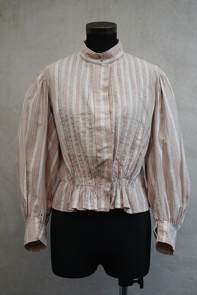 1900年代頃につくられたブラウス。ストライプ織りのコットン素材です。綺麗な燻んだピンク色、タックやギャザー使いが美しい品です。袖口はホックで留める仕様、フロントのトップはホックで、その下はガラスボタンで留めます。ボタンホールは手縫いです。ホックなどの金具まわりに錆染みがあります。小さな穴や染み、直し跡、擦れなど多少の傷みがあります。ウエスト周りは74cm程で、フロントとバックに細かくギャザーが入りシェイプされた綺麗なシルエットです。