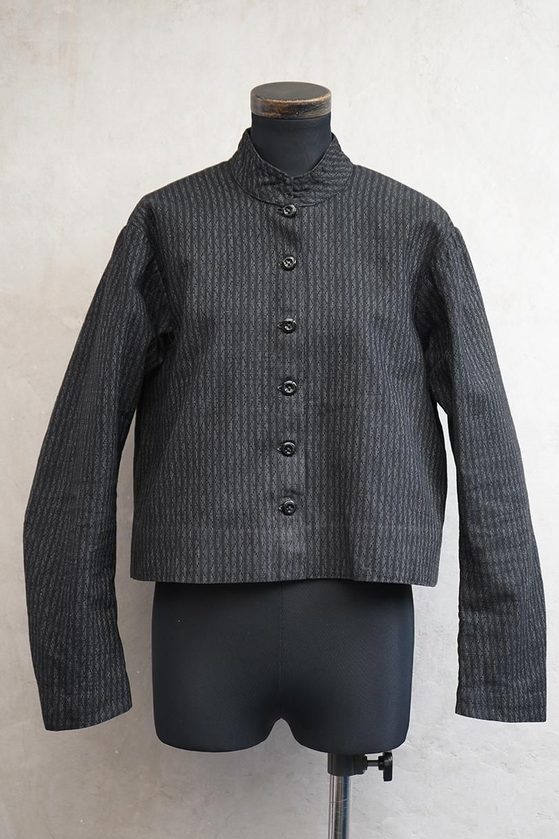 20世紀初期頃につくられたコットン・ブラウス/ジャケット。大部分が手縫いでつくられた素朴な雰囲気のある品です。表地はストライプの織り柄の入った綺麗な布地が使用されていますが、裏地には使い古しの様々な布地がパッチワークのように縫い付けられています。裏地に色褪せや染みなど経年の傷みがありますが、表地は綺麗です。ボタンはガラス製です。バックの裾が跳ねるようなシルエットが綺麗です。