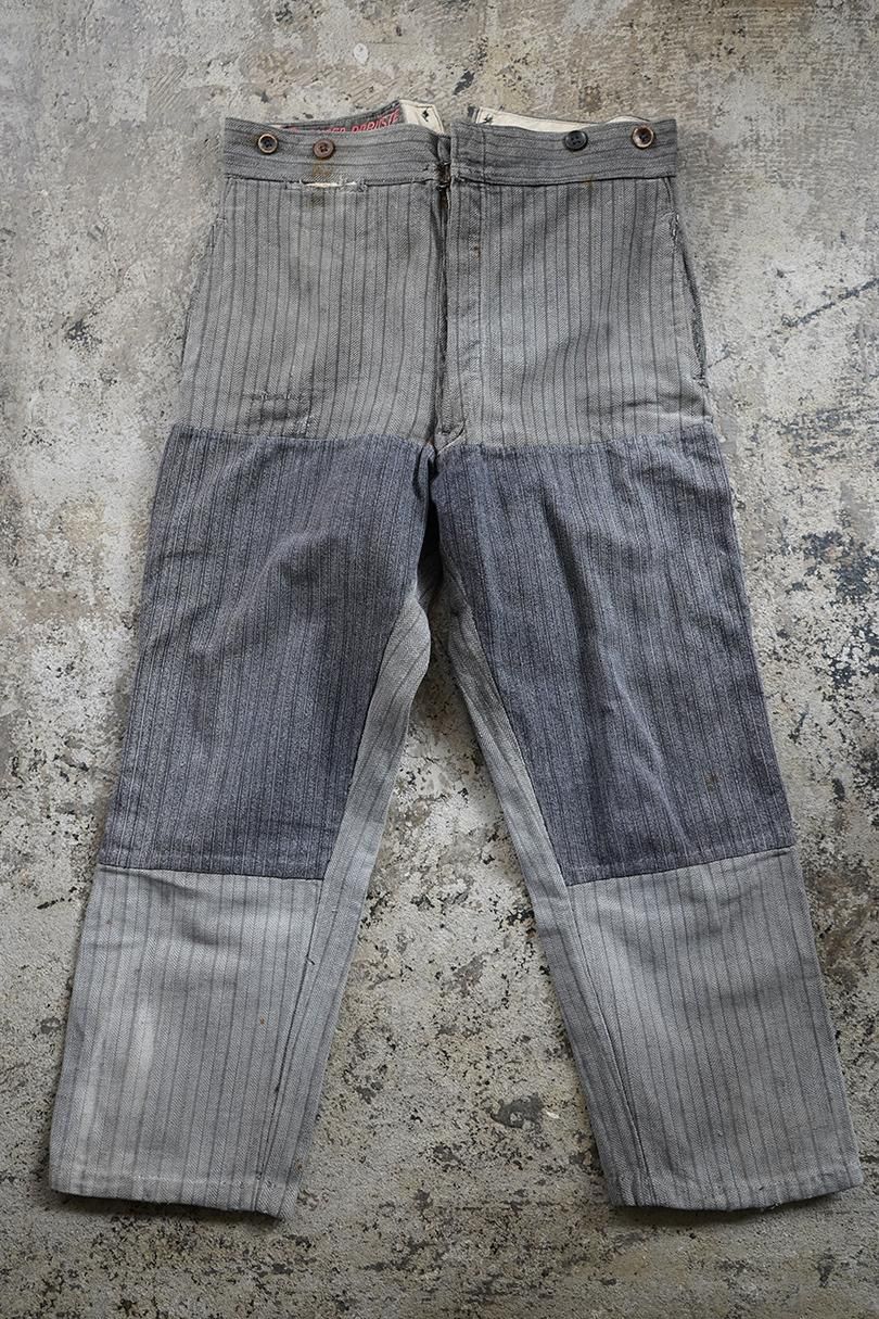 1930年代から1940年代頃につくられたストライプ織柄コットンのワーク・パンツ。黒地に赤く"SUPER-ROBUSTE"と記されたタグがついています。使い込まれて両膝部分にストライプ柄コットンの別布を接いだ直しがされています。 フロントはボタンフライ、ウエストラインにサスペンダー用ボタン、バックシンチ。ボタンは様々なものにつけ替わっています。擦れやシミなどの使用感があります。