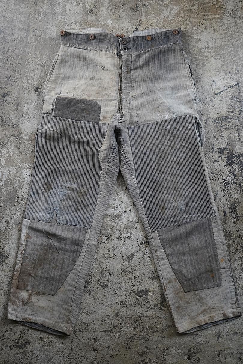 1940年代頃までにつくられたワーク・パンツ。グレーのストライプ柄がプリントされたコットン・モールスキン素材、かなり使い込まれて、別布がパッチされた直しが多くされた様子が味わいのある品です。フロント・トップは2連ボタン留め、フロントはボタンフライ、ウエストラインにサスペンダー用ボタン、バックシンチ。ボタンはメタル製。両サイドに8cmから10cmの裂けがあり、穴やほつれ、シミ等、かなりの使用感があります。ウエストラインのバック中央左側にネズミにかじられたような削れた部分があります。布地が弱っている部分が多くありますので、直しながらご愛用できる方、ダメージを気にされない方にお勧めします。