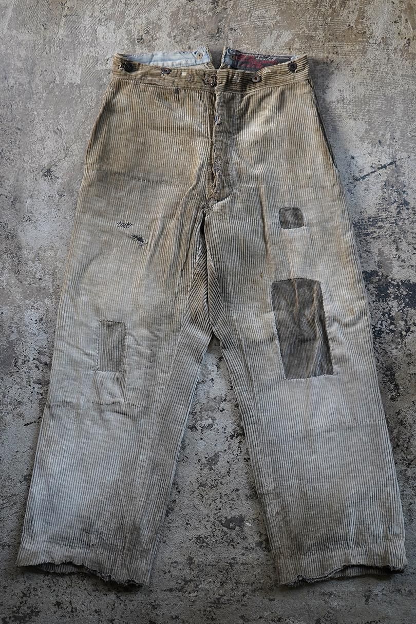 1940年代頃までにつくられたコーデュロイのワークパンツ。リヨンの老舗ワークウエア・メーカー"Adolphe Lafont"のもの。褪色してベージュになったコーデュロイ。所々、布を接いだ直しがされています。手縫いの直し痕も見られます。裾部分は削れて擦り切れています。フロントはボタンフライ、ウエストラインにサスペンダー用ボタン、バックシンチ。擦れや穴、ボタンなど金具に錆、シミがある等、使用感がありますが、着用に問題ない程度です。