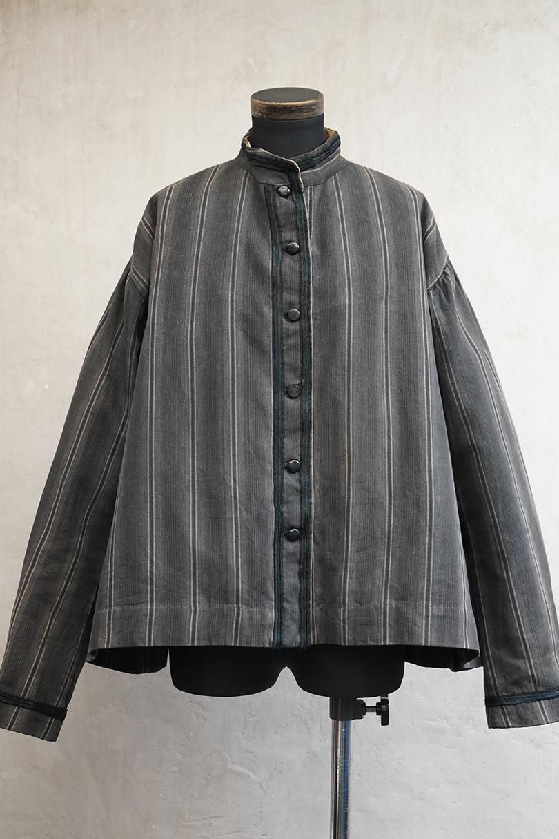 20世紀初期頃までにつくられたブラウス。表地は落ち着いたグレーストライプのコットン生地、裏地はインディゴチェックのコットン生地が使用されています。2枚布で少し厚みがあるのでジャケットのように羽織ものにも使いやすいです。裏地も綺麗なので、裏地を表にして使用するのも良いと思います。肩の落ちるシルエット、ボタンは全てコロゾナットですが2個付け替えられています。左袖口やネック周りに擦れがあります。古い年代の物ですが、比較的状態が良くサイズも珍しく大きめです。